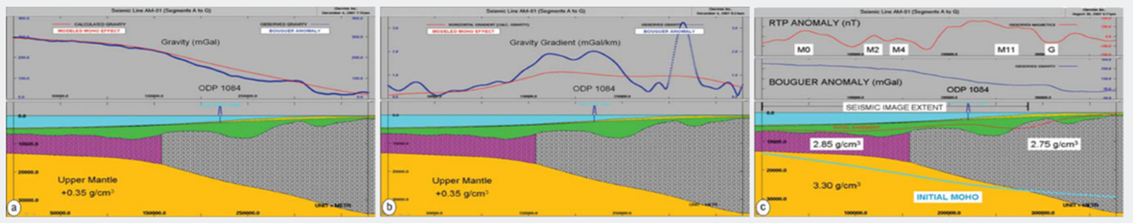 Advanced modeling exercise from Terraquest in which a model of mantle (yellow), oceanic crust (purple), continental crust (grey stippled) and overlying unconsolidated sediments. Modeling is used to derive parameters for each unit (image C) to verify starting model for further interpretation.